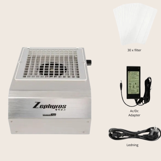 Ved at bruge Zephyros støvudsugning er du ganranteret støvfrit arbejde i din neglesalon. Denne støvudsygning er en af de førende på markedet og er særdeles velegnet til dig som sidder og laver negle på daglig basis. Teknologien bag Zephyros udsugningssystem er så gennemførst at selv de fineste små støvpartikler i det fine støvfilter og ikke dit neglebord eller i luften. Støvudsugningen er på grund af sin lave vægt også velegnet til mobile aktiviteter. Ydermere er denne Dust Collector fremstillet i et ergonomisk design, som sikrer dig et redskab hvor også din kropsholdning er sat i fokus.