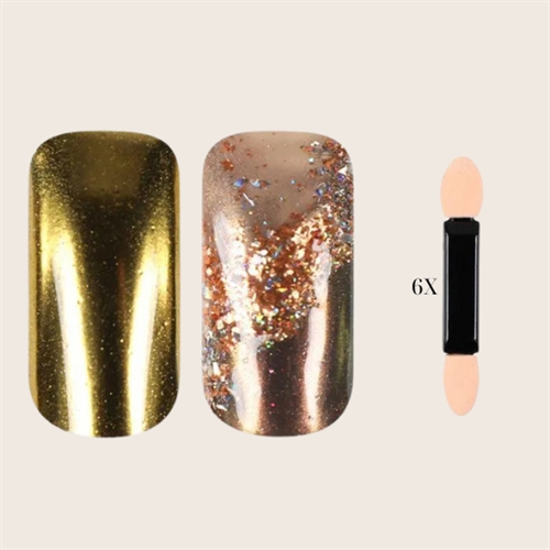 Med Emmi-Nail Chrome Powder-Set i guld kan du skabe den populære spejleffekt på dine negle. Sættet indeholder 6 forskellige guldtoner, som er perfekt afstemt til at give en smuk, skinnende chromeglans – ideelt til både hverdagsbrug og festlige lejligheder som jul. Alt efter hvilket farvegel du anvender som base, opnår du unikke farveeffekter, der gør dine gelnegle til et ægte blikfang.