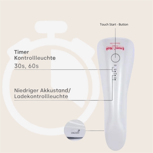 Enheden/lampen startes ved at vælg en af ​​de to timerfunktioner (30, 60 sekunder) lampen besidder. Straks ved tast på timerfunktion starter lampen og du kan læne dig tilbage mens lampen hærder dine produkter