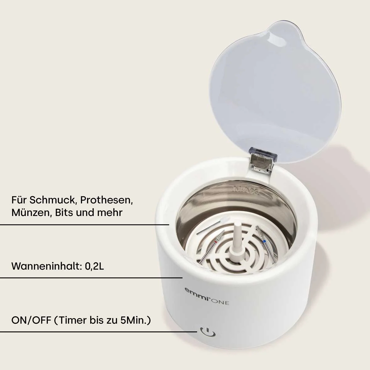 Ultralydsrenseren er velegnet til grundig og skånsom rengøring af blandt andet bits, sakse, pincetter, negleværktøj, smykker og proteser. Med en arbejdsfyldning på 0,18 liter og en robust rustfri stålbeholder sikrer apparatet en effektiv rengøring – også på svært tilgængelige steder.