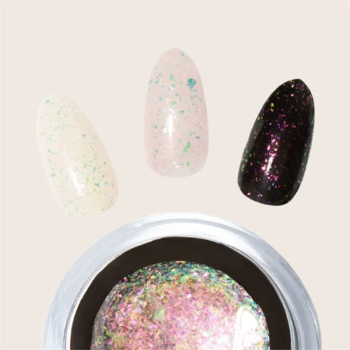 Glitter Builder Gel -002- forener alt, hvad du elsker ved builder gele – med et magisk strejf af glamour! Den mellemviskose og selvglattende formel gør det nemt at opbygge stærke og smukke negle, samtidig med at de fine glimmerpartikler og funklende shapes skaber en eventyrlig effekt.
