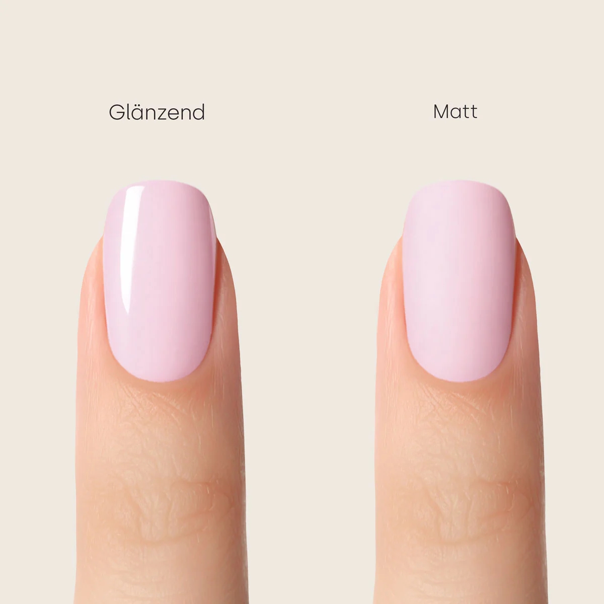 6. Når sidste lag Glossy Gel er hærdet påføres Emmi-Nail Sealing Velvet Mat direkte på den hærde Glossy gel og hærdes derefter i 240 sek. i din uv/led lampe.