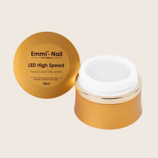 Emmi-Nail High-Speed ​​​​French Gel Milky White 50 ml er medium tyktflydende og perfekt til naturlige negleforstærkninger/negleforlængelser og babyboomer negle. Builder gelen anvendes som et opbyggende lag efter Base gelen.