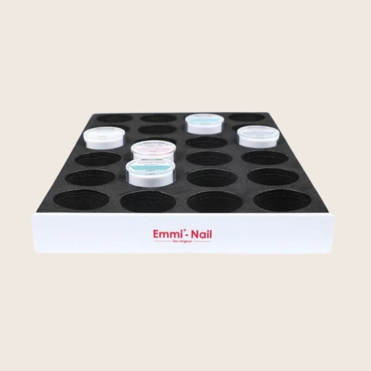 Få styr på din samling af color gel med Emmi-Nail Opbevaringssystem! Dette praktiske display har plads til 24 krukker med en maksimal diameter på 35 mm, hvilket gør det ideelt til opbevaring af Emmi-Nail color gel. Den bløde skumindsats beskytter dine gels mod spild og holder dem organiseret på en elegant måde.