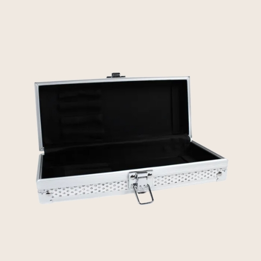 Den praktiske Emmi-Nail Penselboks i hvid og sølv er designet til at beskytte dine pensler og negleværktøjer på en stilfuld måde. Denne boks, dekoreret med funklende rhinestones, er ikke kun funktionel, men også en ægte blikfang på ethvert neglebord. Boksen beskytter dine pensler mod UV-stråler og kan opbevare mindst 8 pensler, støvbørster, tools, pincetter eller neglesakse. Perfekt til både salonen og til at tage med på farten.