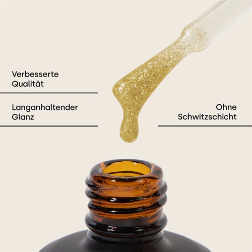Emmi-Nail Sealing Gold Topcoat 14ml er en medium tyktflydende gele og giver dit negledesign en elegant og skinnende effekt i flere uger. De fine glitter pigmenter fremtryller en spændende effekt på neglene. Den beskytter pålideligt dit negledesign mod ridser.