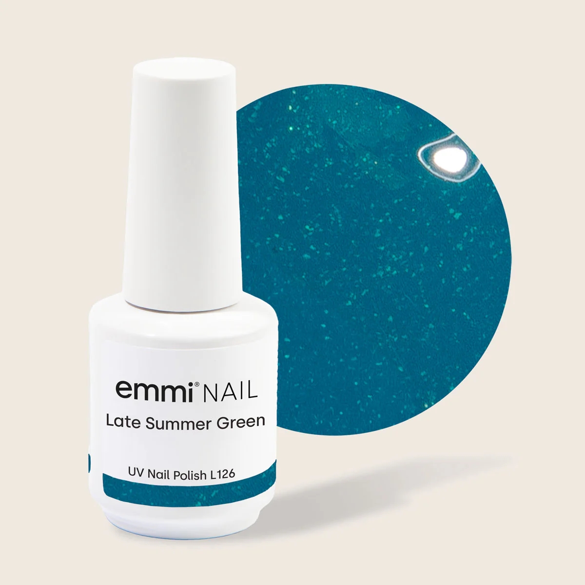 Skab et elegant og moderne look med Late Summer Green, en türkisgrøn farve med glimmer. Denne UV-Lack tilføjer et strejf af glamour til dine negle og giver en eksklusiv glans, der holder i op til 3 uger. Den ridsefaste overflade og holdbare konsistens gør den perfekt til naturnegle, samtidig med at den er nem at påføre.